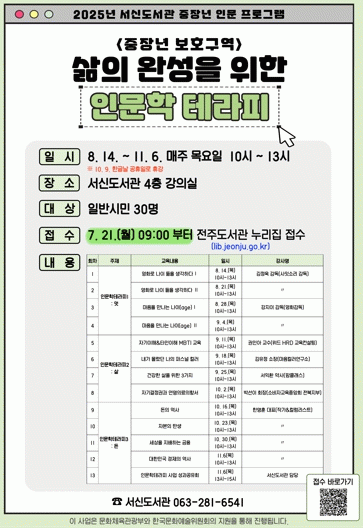 서신도서관은 올해 문화체육관광부가 주최하고 한국문화예술위원회가 주관한 ‘2025년 중장년 인문프로그램’ 공모사업에 전주문화재단, 삼천문화의집과 함께 협력한 ‘중년보호구역’ 프로그램이 선정됐다고 21일 밝혔다.