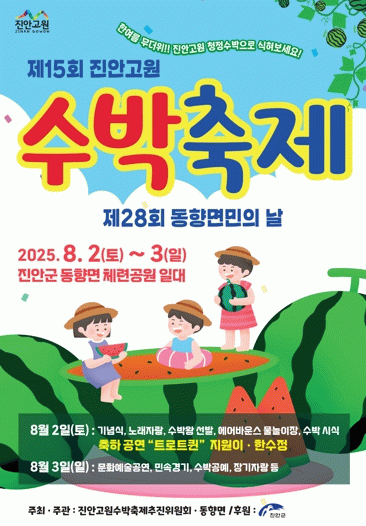 올해로 15회를 맞이하는 진안고원 수박축제는 고랭지의 청정한 자연환경에서 자란 고품질 진안 수박을 알리고, 군민과 관광객이 함께 어울릴 수 있는 여름 대표 축제로 자리 잡아왔다.