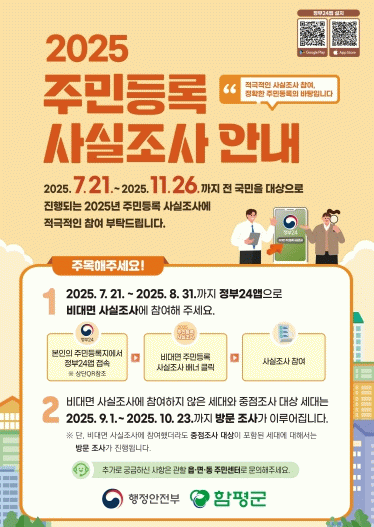 함평군은 21일 “전 군민을 대상으로 ‘2025년 주민등록 사실조사’가 이날부터 11월 26일까지 실시된다”고 밝혔다.