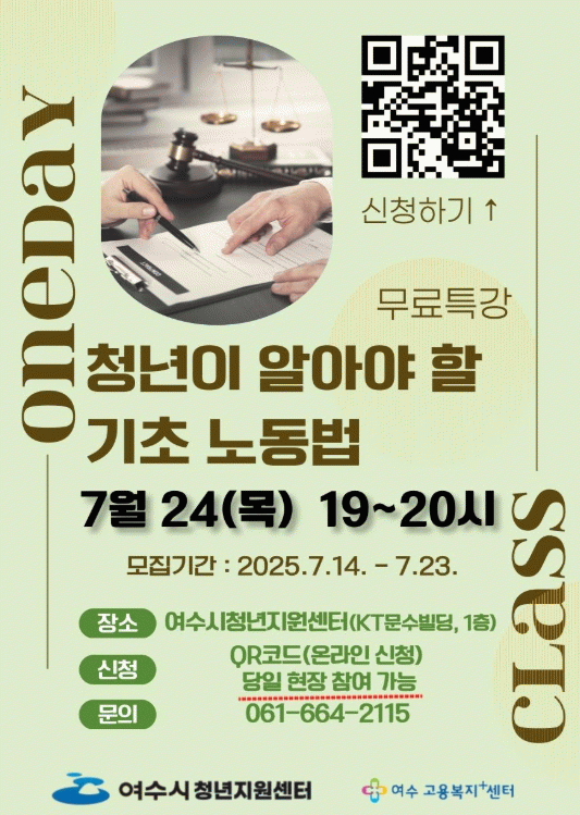 특강에서는 근로계약서 작성, 근로조건 확인, 노동 관련 권리와 의무 등 청년들이 취업과 근로 시 꼭 알아야 할 노동법의 기초 내용을 다룬다. 강의는 여수고용노동지청 근로개선지도과 소속 직원이 직접 진행한다.