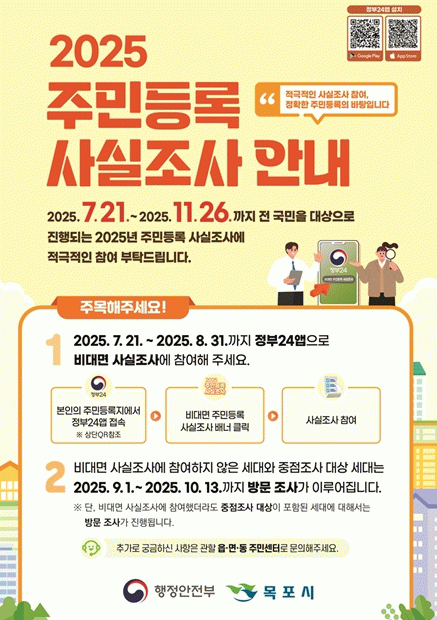 비대면 조사는 주민등록지에 거주 중인 세대원이 정부24에 접속해 사실조사 항목에 응답하는 방식으로 진행되며, 세대별 1인이 전체 세대를 대표해 응답할 수 있다.