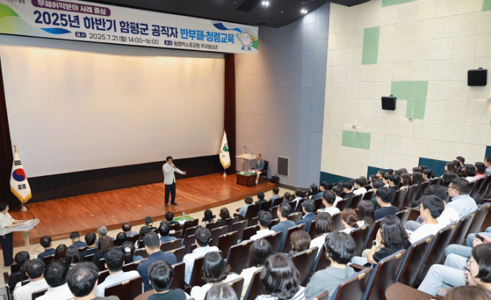 함평군은 22일 “하반기 반부패‧청렴교육이 지난 21일 엑스포공원 주제영상관에서 하반기 승진자, 신규자, 부패취약분야 담당자를 포함한 공직자 200여 명을 대상으로 실시됐다“고 밝혔다.