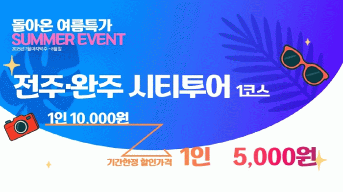 여름 특가 이벤트는 이달 7월 말부터 8월 말까지 출발하는 전주·완주 시티투어 상품에 적용되며, 1인당 5000원에 이용할 수 있다.