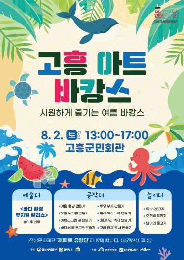 군 관계자는 “무더운 날씨에 지친 군민들이 ‘고흥아트바캉스’를 통해 삶의 활력을 되찾고, 가족과 행복한 시간을 보내길 바란다”고 말했다.
