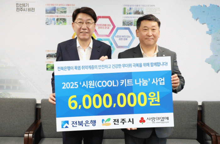 전주시 관계자는 “최근 장기화된 폭염으로 취약계층의 건강관리에 어려움이 크다”면서 “전북은행의 지원으로 보다 많은 분들이 안전한 여름을 보낼 수 있게 됐다”고 말했다.