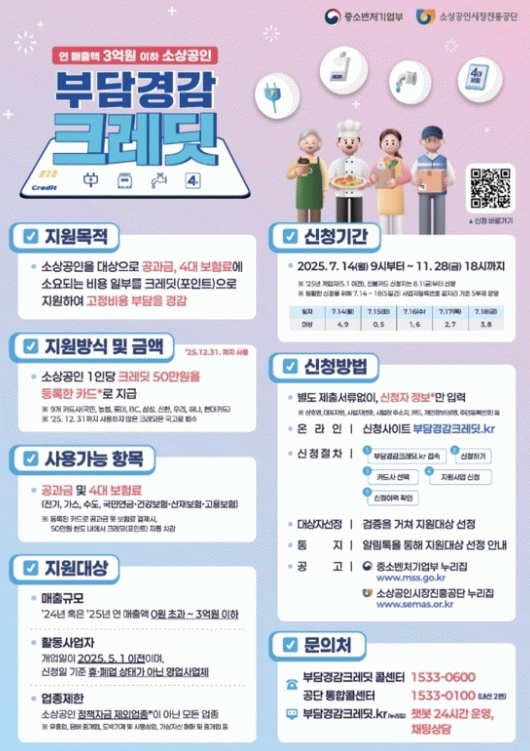 신청 기간은 11월 28일 오후 6시까지이며, 온라인 전용사이트 ‘부담경감크레딧’또는 ‘소상공인24’를 통해 신청할 수 있다.