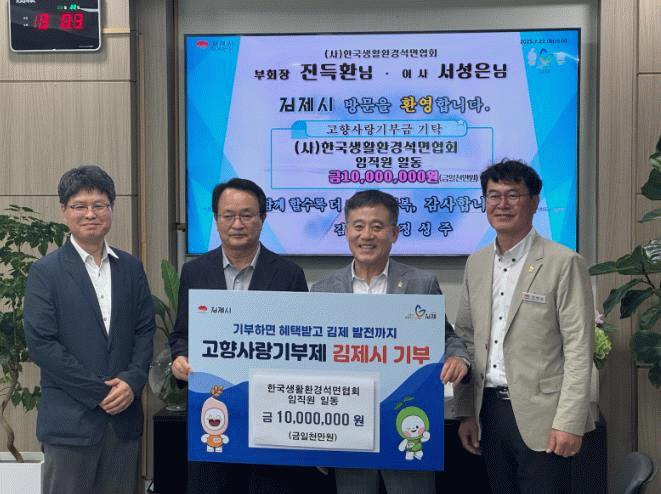 정성주 김제시장은 “김제에 대해 관심을 가져주신 송석환 대표 및 한국생활환경석면협회 임직원들에 감사를 표한다”며 “기부금은 김제시의 발전 및 시민의 복리 증진을 위해 소중히 사용하겠다”고 말했다.