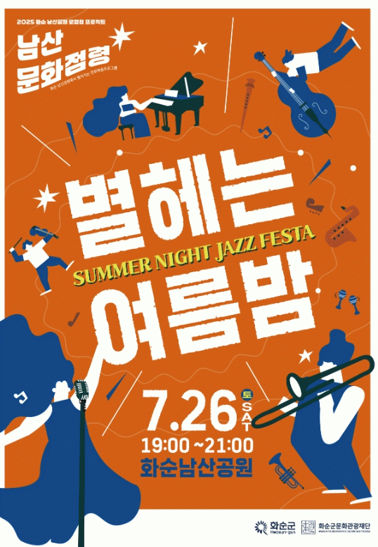 7월 26일 저녁 7시부터 9시까지 화순 남산공원 야외무대에서 ‘재즈 음악’을 주제로 다채로운 공연을 진행한다.