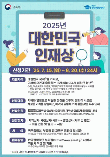최경화 대학인재정책과장은 “지역 우수 인재 발굴을 통해 청년들이 역량을 발휘하고 성장할 수 있는 기회를 제공하겠다”며 “대한민국 인재상 선발을 계기로 지역 인재 육성에 대한 사회적 관심도 높아지길 기대한다”고 말했다.