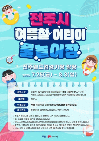 한편 물놀이장 운영에 대한 자세한 사항은 천년전주 콜센터 또는 전주시 산림공원과로 문의하면 안내를 받을 수 있다.