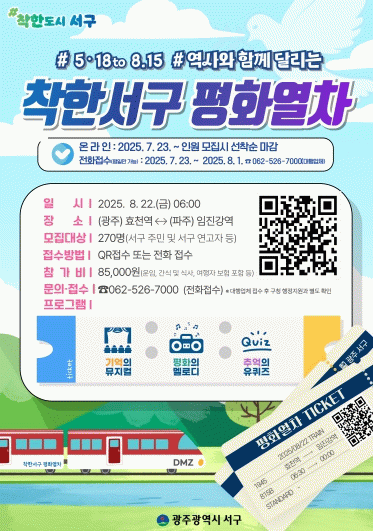 김이강 서구청장은 “이번 평화열차는 단순한 여행이 아니라, 분단 현실을 직시하고 통일의 미래를 함께 준비하는 주민 공감의 장이 될 것”이라며 “많은 주민들이 평화의 여정에 동참해 주시길 바란다”고 밝혔다.