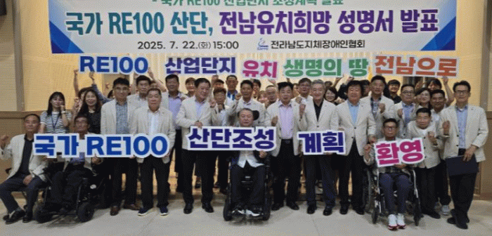 전남지체장애인협회는 성명서를 통해 “전라남도는 전국 최고 수준의 일사량과 해상풍력 등 재생에너지 자원이 풍부하며, 한국전력 본사와 한국에너지공과대학 등 핵심 에너지 기관 등 다양한 인프라가 밀집해 있는 RE100 산업단지 조성에 가장 적합한 입지 조건을 갖춘 지역”이라고 말했다.