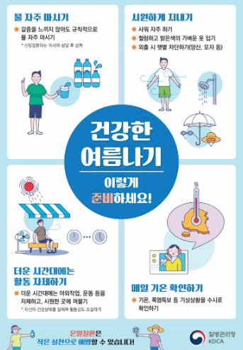 한편 온열질환의 발생 현황과 특성을 감시하는 ‘온열질환 응급실감시체계’를 운영하고 있으며 ‘방문건강관리사업’으로 취약 계층에게 폭염 대비 건강관리 사항을 안내하고 있다.