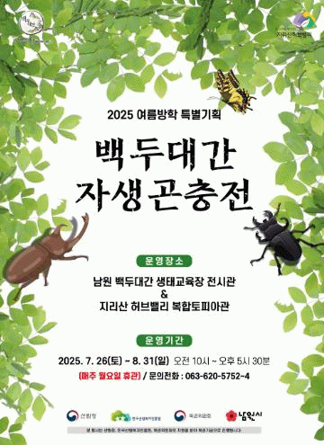산림청 등의 후원을 받아 녹색자금으로 운영되는 이번 특별기획전은 백두대간 생태계의 근간이 되는 다양한 곤충을 주제로 한 기획전으로 50여 종 1,000여 마리의 백두대간 속 곤충과 곤충을 닮은 다양한 절지동물을 만날 수 있으며 ‘백두대간 생태교육장’과 ‘지리산 허브밸리’에서 함께 운영한다.