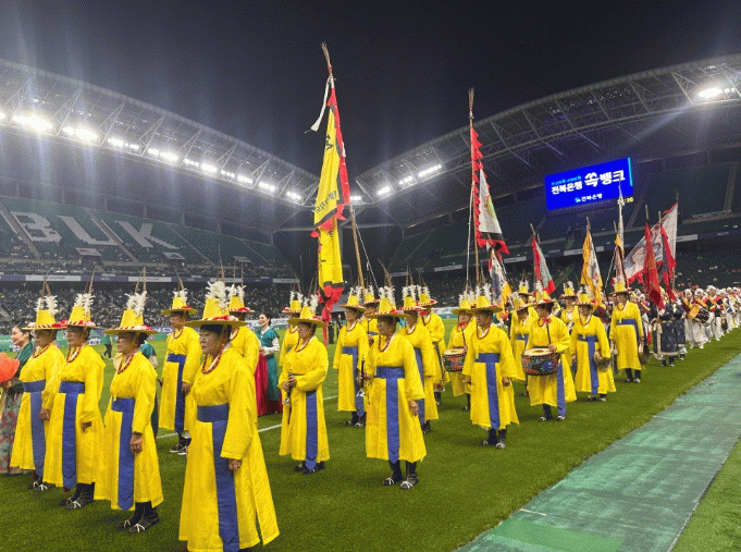 익산시는 지난 23일 K리그 전북현대모터스와 강원FC 경기가 열린 전주 월드컵경기장에서 거리극 축제 '노상놀이야' 통합퍼레이드가 열렸다고 24일 밝혔다.