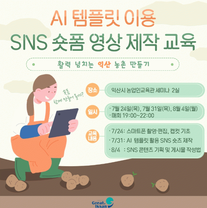 익산시농업기술센터는 24일부터 3회(총 9시간) 과정으로 '인공지능(AI) 템플릿 이용 사회관계망서비스(SNS) 숏폼 영상 제작' 교육을 진행한다.