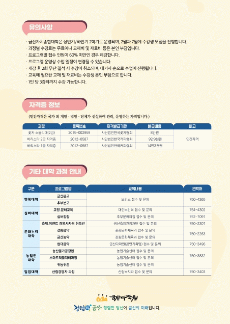 금산다락원 관계자는 “단순 취미·소양 강좌보다는 지역사회에 활용할 수 있는 교양 강좌 및 창업 관련 과정을 제공해 자기 발전 및 사회공헌에 기여할 수 있는 인재 양성에 도움을 줄 것”이라고 말했다.