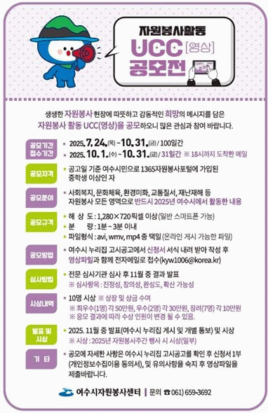 이번 공모는 여수 지역에서 2025년 활동한 내용을 영상으로 제작해 응모하는 방식으로 사회복지, 문화체육, 환경미화, 교통질서, 재난재해 등 자원봉사 모든 분야를 대상으로 한다.