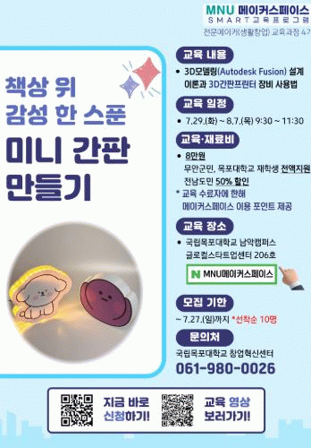 한편, 상시 운영 중인 메이커스 7월 체험 프로그램 신청은 MNU메이커스페이스 누리집에서 확인할 수 있으며, 자세한 사항은 MNU메이커스페이스로 문의하면 된다.