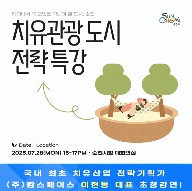 이번 특강은 순천시가 추진하는 ‘치유산업’을 지역 경제를 순환시키는 강력한 터빈으로 만들고, ‘태어나서 꼭 한번은 가봐야 할 도시’로 탈바꿈시키기 위한 대장정의 첫걸음이다.