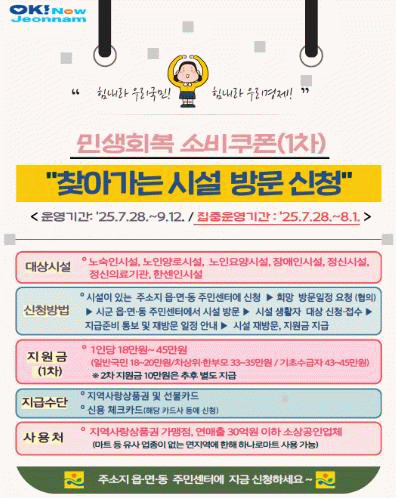 정광선 전남도 보건복지국장은 “이번 민생회복 소비쿠폰이 시설 생활자에게 실질적 도움이 되는 만큼, 모두가 빠짐없이 혜택을 받도록 촘촘히 챙기겠다”며 “주소지가 해당 시군이 아닌 경우 보호자가 대리 신청할 수 있도록 적극 안내해 지급 누락이 없도록 하겠다”고 말했다.