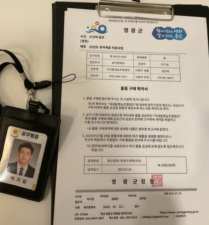 아울러 위조된 명함, 공문, 계약서 등 수상한 문서를 받거나 사기 행위가 의심될 경우, 즉시 군청 또는 가까운 경찰서에 신고해 줄 것을 당부했다.