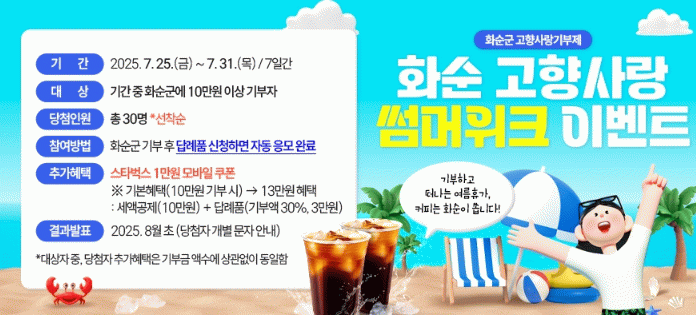 주창현 자치행정과장은 “이번 ‘화순 고향사랑, 썸머위크’ 이벤트가 여름휴가처럼 가볍고 즐거운 마음으로 고향사랑기부제에 참여하는 계기가 되길 바란다”라며, “앞으로도 기부자 중심의 실질적인 혜택과 공감할 수 있는 참여 프로그램을 지속적으로 발굴하여, 고향사랑기부제가 일상 속 나눔 문화로 자리매김할 수 있도록 최선을 다하겠다”라고 말했다.