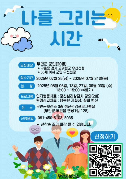 한편, 『2025년 나를 그리는 시간』프로그램 참여 신청 및 자세한 문의사항은 무안군보건소 정신건강팀으로 문의하면 된다.