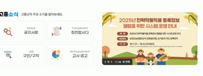 정보공개는 7월 21일부터 8월 4일까지 운영되며, 열람은 농림사업정보시스템 또는 고흥군 대표 누리집 배너를 통해 확인할 수 있다.