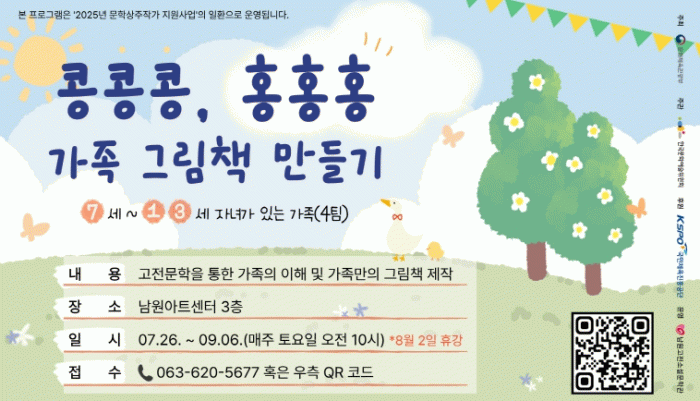 본 프로그램은 ‘2025년 문학상주작가 지원사업(문화체육관광부 주최, 한국문화예술위원회 주관, 국민체육진흥공단 후원)’의 일환으로, 흥부전 등 고전문학 속 가족 이야기를 탐구하며 가족의 의미를 되짚고, 각 가족만의 이야기를 만들어 그림책을 제작하는 것을 주요 내용으로 한다.