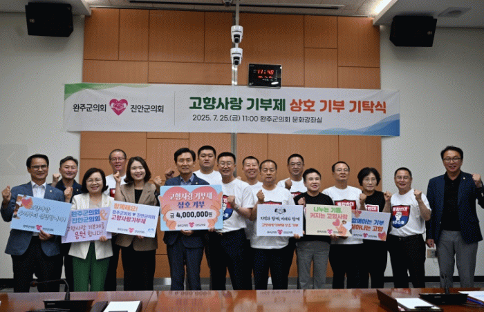 유의식 의장은 “이번 상호 기부는 지역 간 정서적 연대와 가치를 실천한 상징적인 계기”라며, “고향사랑기부제가 지역경제에 활력을 불어넣을 수 있도록 완주군의회가 앞장서며 제도 활성화에 힘을 보태겠다”고 강조했다.