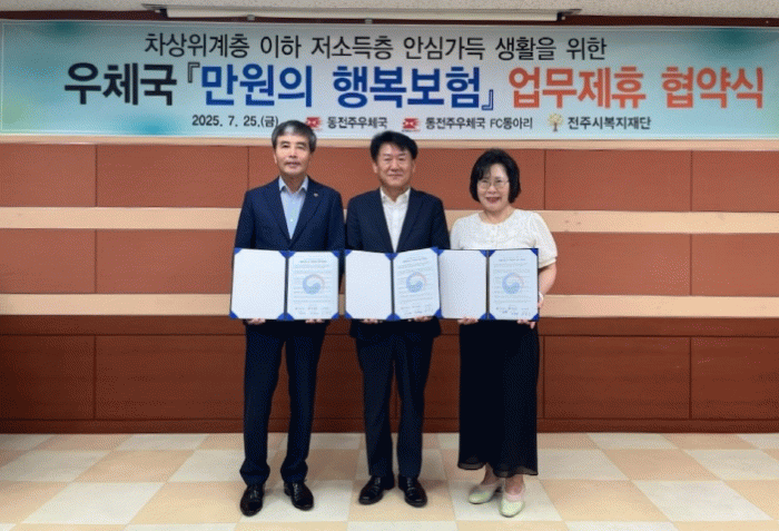 이날 협약에 따라 동전주우체국은 공익보험인 우체국 만원의 행복보험 가입을 추진하고, 전주시복지재단은 보험이 필요한 대상자를 발굴해 연계할 예정이다.