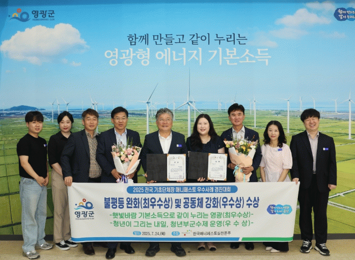 ‘햇빛 바람 기본소득(최우수상)’ 정책은 영광군이 풍부한 재생에너지 자원을 활용해 지역 주민과 수익을 공유하는 모델로, 신재생에너지 발전사업의 이익을 발전사가 독점하지 않고 모든 군민에게 기본소득 형태로 환원하는 획기적인 정책이다. 특히 에너지 자립과 소득재분배로 소멸 위기의 지역을 살리고 벌어진 소득격차를 줄여 불평등을 완화해 최소한의 기본적인 삶을 보장하는 종합정책으로 높은 평가를 받았다.