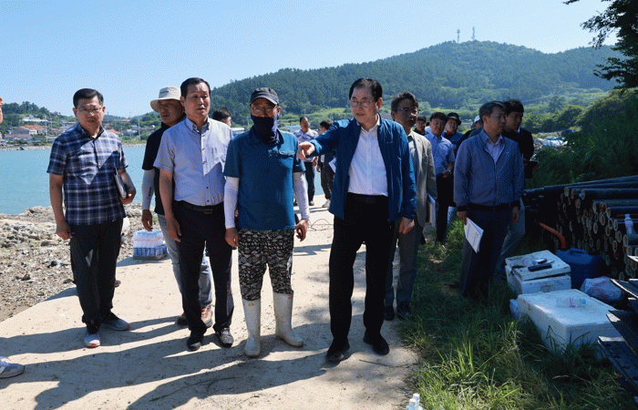 신우철 완도군수는 지난 24일 전복 가두리 감축 사업이 한창인 노화읍 당산리를 찾아 폭염 속에서도 작업에 나선 (사)한국수산업경영인 완도군연합회 회원들과 어업인들을 격려하고 애로 사항을 청취했다.