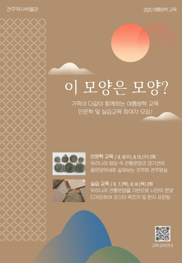 교육에 참여를 희망하는 시민은 오는 8월 4일까지 전주역사박물관 누리집을 통해 예약할 수 있으며, 총 100명(인문학 회당 30명, 실습 회당 20명)까지 참여할 수 있다. 자세한 사항은 카카오톡 채팅(전주역사박물관) 또는 전화로 문의하면 된다.
