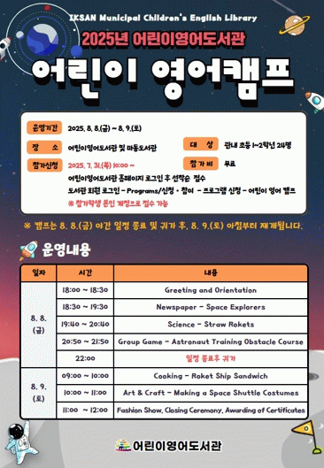 익산시 도서관 관계자는 "이번 영어 캠프는 학습 부담 없이 재미있게 영어를 접하면서 친구들과 함께 소중한 추억을 쌓을 수 있도록 준비했다"며 "방학을 맞은 어린이들에게 영어에 대한 호기심을 키우고, 도서관이라는 공간에서 풍성한 경험을 제공하는 뜻깊은 시간이 될 것으로 기대한다"고 말했다.