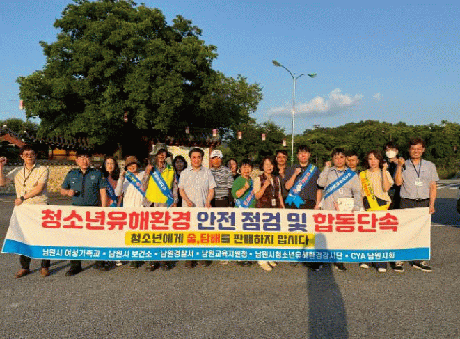 이번 점검에는 남원시 여성가족과와 보건소를 비롯해 남원경찰서, 남원교육지원청, 남원시 청소년 유해환경 감시단 등 관련 기관이 함께 참여하여 유해환경으로부터 청소년의 안전한 생활환경 조성을 위한 협력체계 강화에 힘을 모았다.