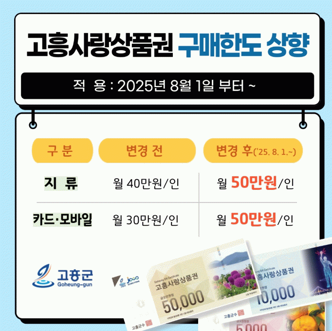 한편, 고흥군은 이번 한도 상향과 함께 8월 한 달간 15% 특별할인 이벤트도 추진해 지역경제 활성화와 군민 체감 혜택을 극대화할 계획이다.