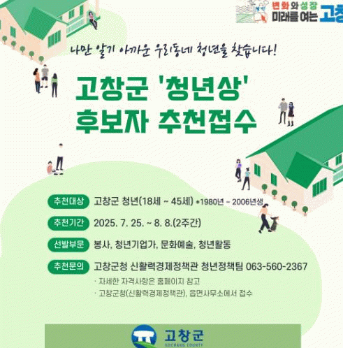 수상자에게는 고창군수 명의의 상장과 상패가 수여되며, 시상식은 9월 20일 ‘청년의 날’ 기념식에서 개최될 예정이다.