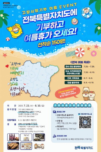 전북자치도는 이번 기부 이벤트와 별도로, 여름휴가철을 맞아 도내 주요 여름축제 일정도 함께 소개하고 있다. 대표적으로는 임실 치즈테마파크 아쿠아페스티벌(7.26.~8.10.), 전주 가맥축제(8.7.~8.9.), 정읍 물빛축제(8.8.~8.10.) 등이 있으며, 축제를 통해 전북의 다양한 매력을 체험할 수 있다.