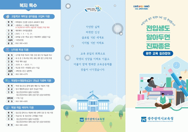 또 복지 역시 일반 부분으로 보편적 교육복지 지원, 교육 급여 및 학생 교육비 지원, 학생 무상 교육비(광주 G-패스) 지원 등이, 특수 부분으로는 고등학교 여학생 생리용품 구입비 지원, 난치병 학생 지원, 학생정서・행동특성검사 관심군 치료비 지원, 학생 마음 바우처 지원 등이 상세히 안내됐다.