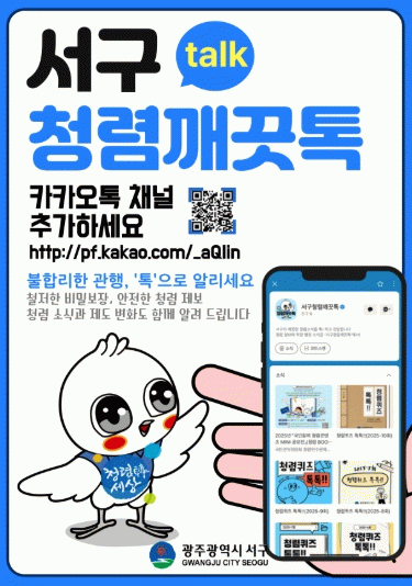 김이강 서구청장은 “청렴은 공직사회의 윤리를 넘어 공동체에 대한 신뢰의 출발점”이라며 “‘청렴깨끗톡’이 누구나 쉽게 다가가고, 함께 목소리를 나눌 수 있는 생활 속 청렴 실천의 통로가 되길 바란다”고 밝혔다.