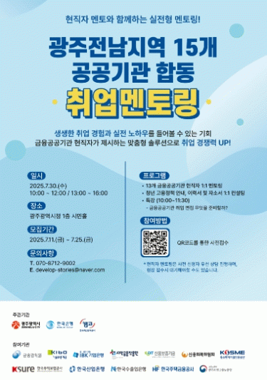 이날 행사에서는 참여기관의 현직 금융맨이 멘토로 직접 나서 1:1 맞춤형 상담(기관당 약 15분)을 진행한다. 취업 특강, 청년고용정책 안내, 이력서 및 자기소개서 1:1 컨설팅도 함께 운영한다.
