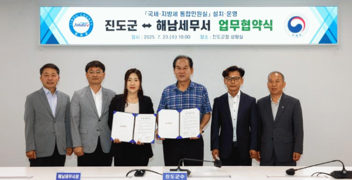 협약식에는 김희수 진도군수와 박현주 해남세무서장을 비롯한 관계자 8명이 참석했고, 협약에 따라 양 기관은 통합민원실을 운영하기 위한 사무공간 확보, 국세 공무원 상시 배치, 전산장비의 설치와 관리 등 행정적 협력을 추진하며, 일원화된 납세 서비스를 제공하기 위해 상호 협력하기로 했다.