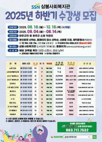 2025년 하반기 모집분야는 노래교실, 스마트폰 활용교육, 소도구 필라테스. 라인댄스, 줌바댄스, 오카리나, 줄리하프, 난타, 집 반찬 만들기, 수채캘리그라피, 홈패션 등 12개 반으로 241명을 모집한다.