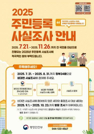 먼저, 7월 21일부터 8월 31일까지는 ‘정부24’ 앱을 활용한 비대면 조사가 진행된다. 이는 맞벌이 가구와 1인 가구 증가로 인한 방문 조사 한계를 고려한 조치로, 본인 또는 주민등록상 동일 세대원이 ‘정부24’ 앱에 접속해 사실조사 항목에 응답하는 방식이다.