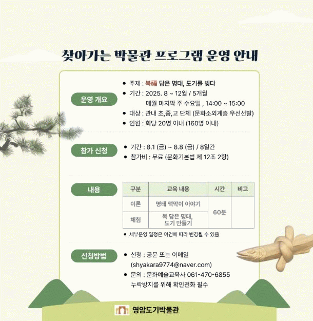 프로그램에는 영암 초등학생과 문화소외계층 등이 참여할 수 있고, 1회당 20명까지 총 160명에게 체험 기회가 제공된다. 참가비는 무료이고, 신청은 영암도기박물관에 8/1~8일 이메일 등으로 할 수 있다.