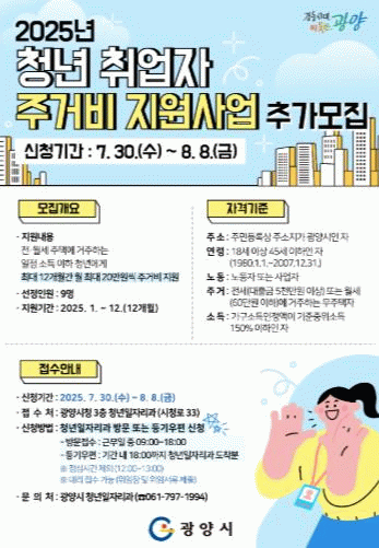 신청 자격은 광양시에 주소를 둔 18세 이상 45세 이하 청년 노동자 및 사업자로, 가구소득인정액이 기준중위소득 150% 이하이며, 전세 대출금 5천만 원 이상 또는 월세 60만 원 이하에 거주하는 무주택자여야 한다.