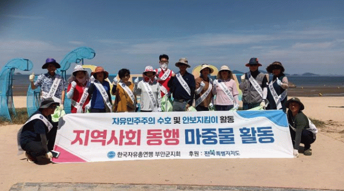한편 한국자유총연맹 부안군지회는 자유민주주의의 항구적 옹호·발전과 자유민주적기본질서에 입각한 평화통일을 목표로 소외계층 생필품 지원사업, 코로나19 극복캠페인, 취약계층 집수리 및 밑반찬 나눔, 고향사랑기부금 기탁 등 다양한 활동을통해 주위의 귀감이 되고 있으며, 다가오는 8월 7일에는 사회단체 생수 무료 나눔릴레이 봉사에도 참여할 예정이다.