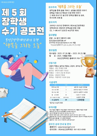 이번 공모전은 ‘보성군장학재단과의 동행 – 행복을 그리는 오늘’을 주제로, 장학금을 통해 이루어낸 꿈과 성장, 학업 및 인생 변화, 위기 극복 사례 등을 진솔하게 나누며 후배들에게 희망과 용기를 전하고자 기획됐다.
